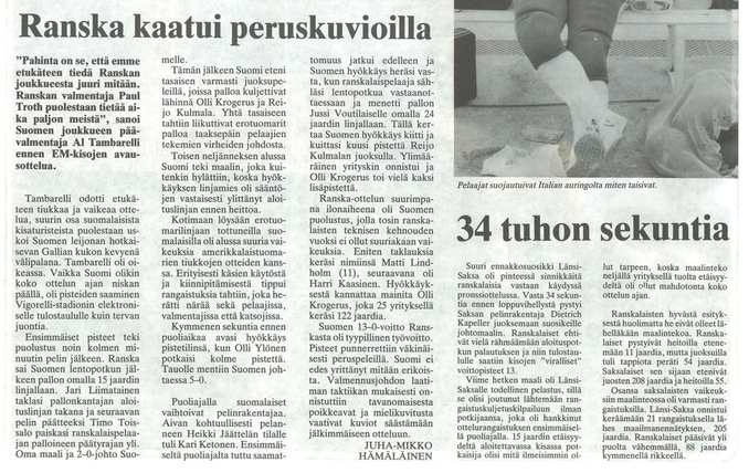 Suomi voitti ennakkosuosikki Italian pistein 13-2 amerikkalaisen jalkapallon EM-finaalissa Milanossa fanaattisen italialaisyleisön nenän edessä. Ottelun sankarina oli Suomen joukkueen puolustus, joka ei laskenut italialaisia tekemään pistettäkään. -Tästä eivät enää fiilikset parane, iloitsi Suomen Euroopan Mestaruuteen amerikkalaisessa jalkapallossa luotsannut pelinrakentaja Risto Luostarinen.
