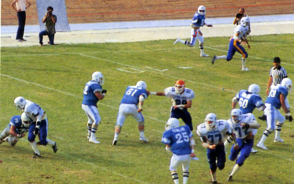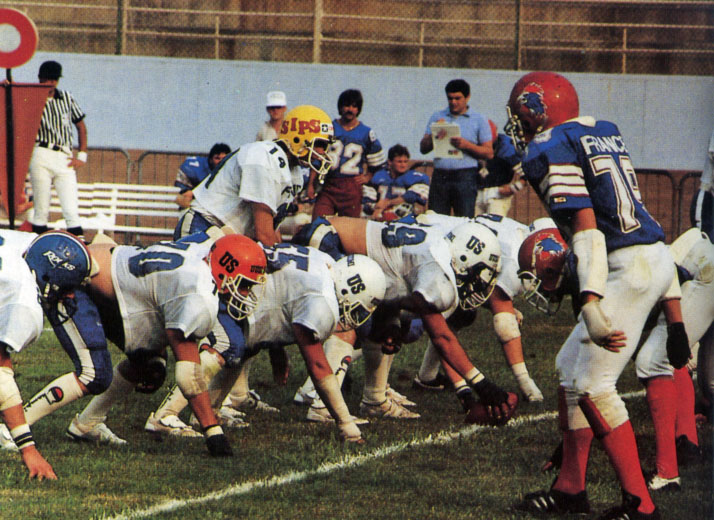 Maajoukkue pelasi toisen kerran USA:laista yliopistojoukkuetta vastaan vuonna 1985. Ottelun areenana oli suomalaisen jenkkifutiksen pyhättö Helsingin Pallokenttä, jonne saapui michiganilainen Alma College Scotts. Ottelussa oli samanlaiset sävelet kuin vuotta aiemmassa Cardinals-ottelussa. Suomalaiset saivat aikaan muutamia kunnon hyökkäyksiä, jotka päättyivät puoleenkenttään. Ottelussa maajoukkueen päävalmentaja new yorkilainen Al Tambarellin tarkkaili 48 suomalaispelaajaa matkalla EM-kisoihin, jotka järjestettiin heinäkuussa Italiassa.