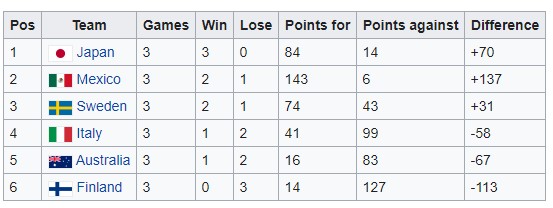 Ensin maajoukkuetta kokosi edellisen vuoden päävalmentaja Jorma Hytönen. Talousvaikeuksien johdosta edustajaksi lopulta valikoitui seurajoukkue Porvoo Butchers. Kyseessä ei ollut siis Suomen varsinainen maajoukkue vaan Butchers, joka taisteli sisukkaasti Suomen väreissä sisukkaasti. Joukkue hävisi kaikki kolme otteluaan. Runkosarjassa joukkue hävisi Italialle 28-7 ja Meksikolle 89-0. Australia voitti sijoitusottelussa Suomen joukkueen 10-7.