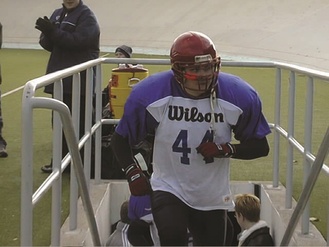 Maajoukkuekapteeni Timo Winqvist saapuu kentälle Velodromin tuubista.