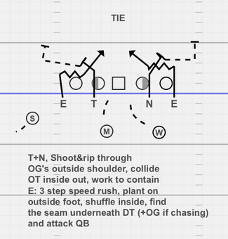 The interior DL shoots and rips hard through the outside shoulder of OG, upfield penetration is a must, and the lane can be a bit wide. He then aims at the inside shoulder of the OT and pushes him outside before working underneath to contain the possible escaping QB.