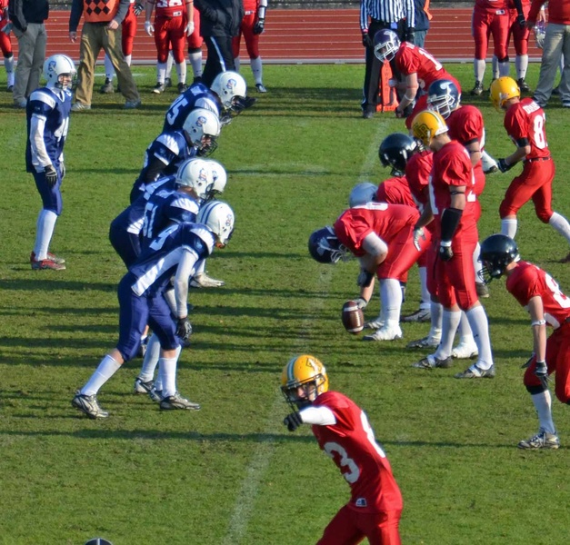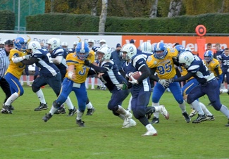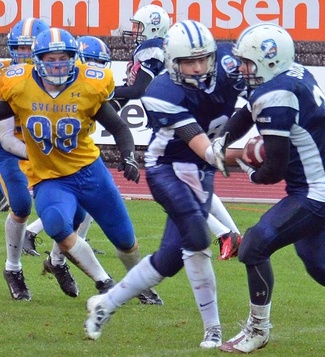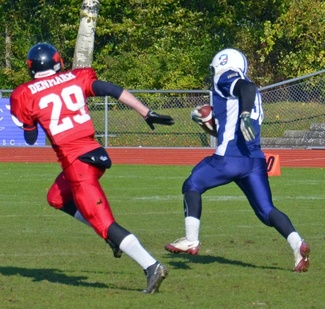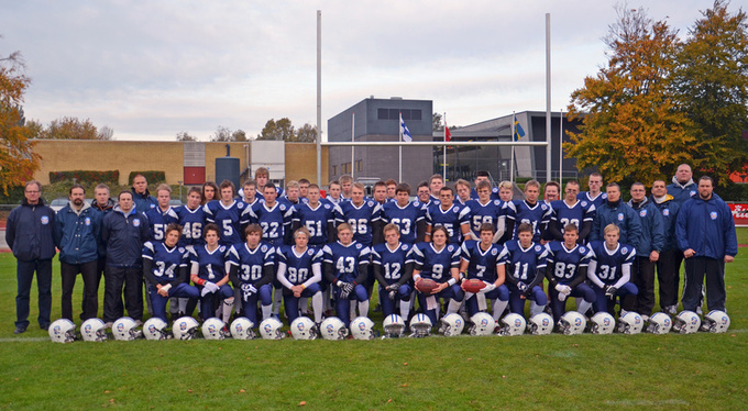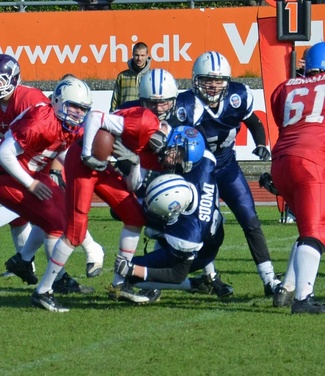 Tanska pääsi pitkällä heitolla ja henkilökohtaisen rikkeen johdosta 35 jaardin päähän maalista. Kolme heittoa meni kuitenkin harakoille ja linjapuolustaja Henri Toiminen kävi toistamiseen niittamassa tanskalaispallonkantaja Henry Mullerin Odensen nurmeen.